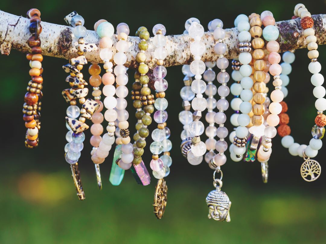 Våre armbånd er laget med mange forskjellige perler for å skape spill og uttrykk. Perlene er blant annet i akryl, tre, rustfritt stål og naturstein. Dette står spesifisert bedre under beskrivelsen.