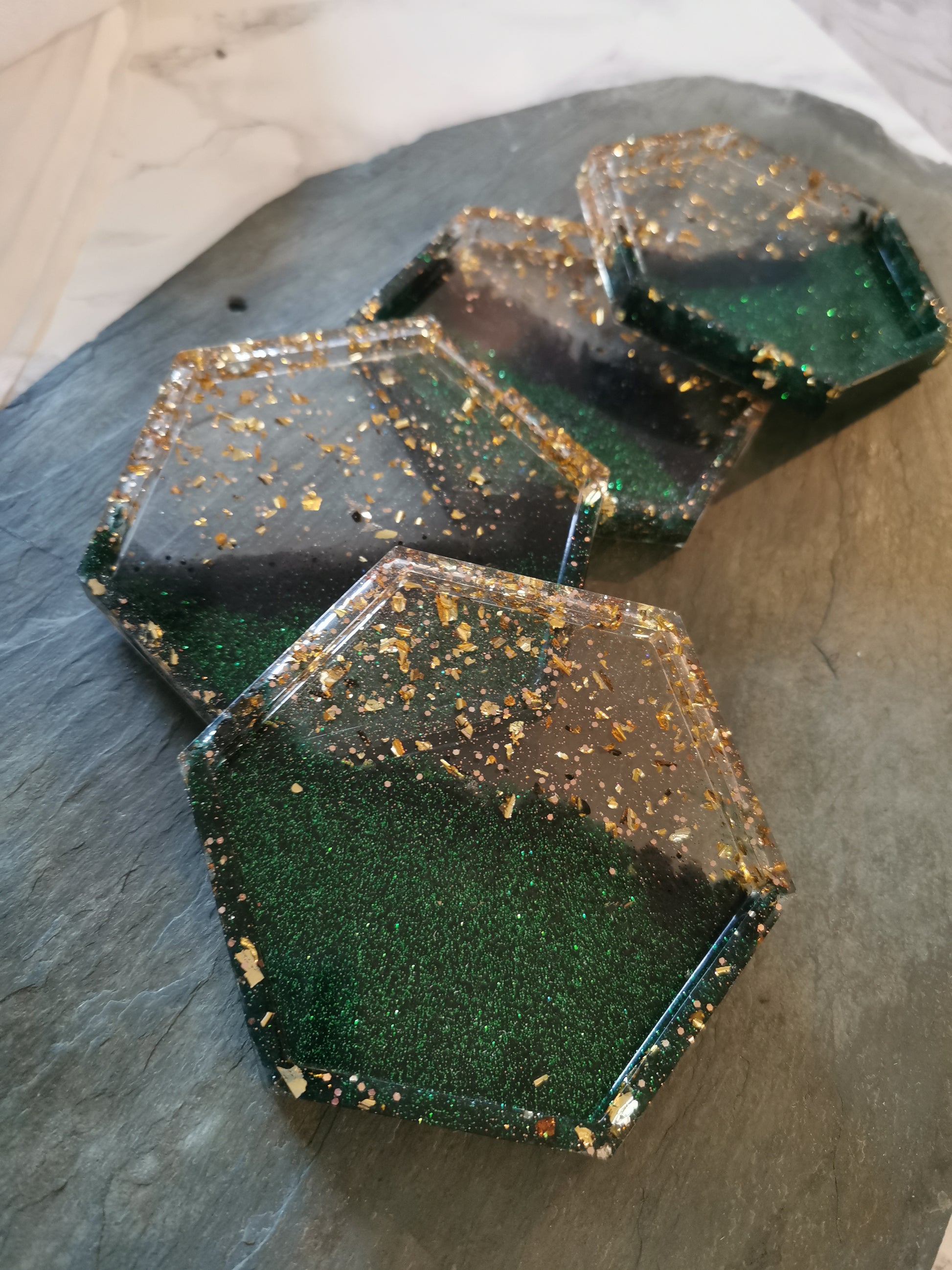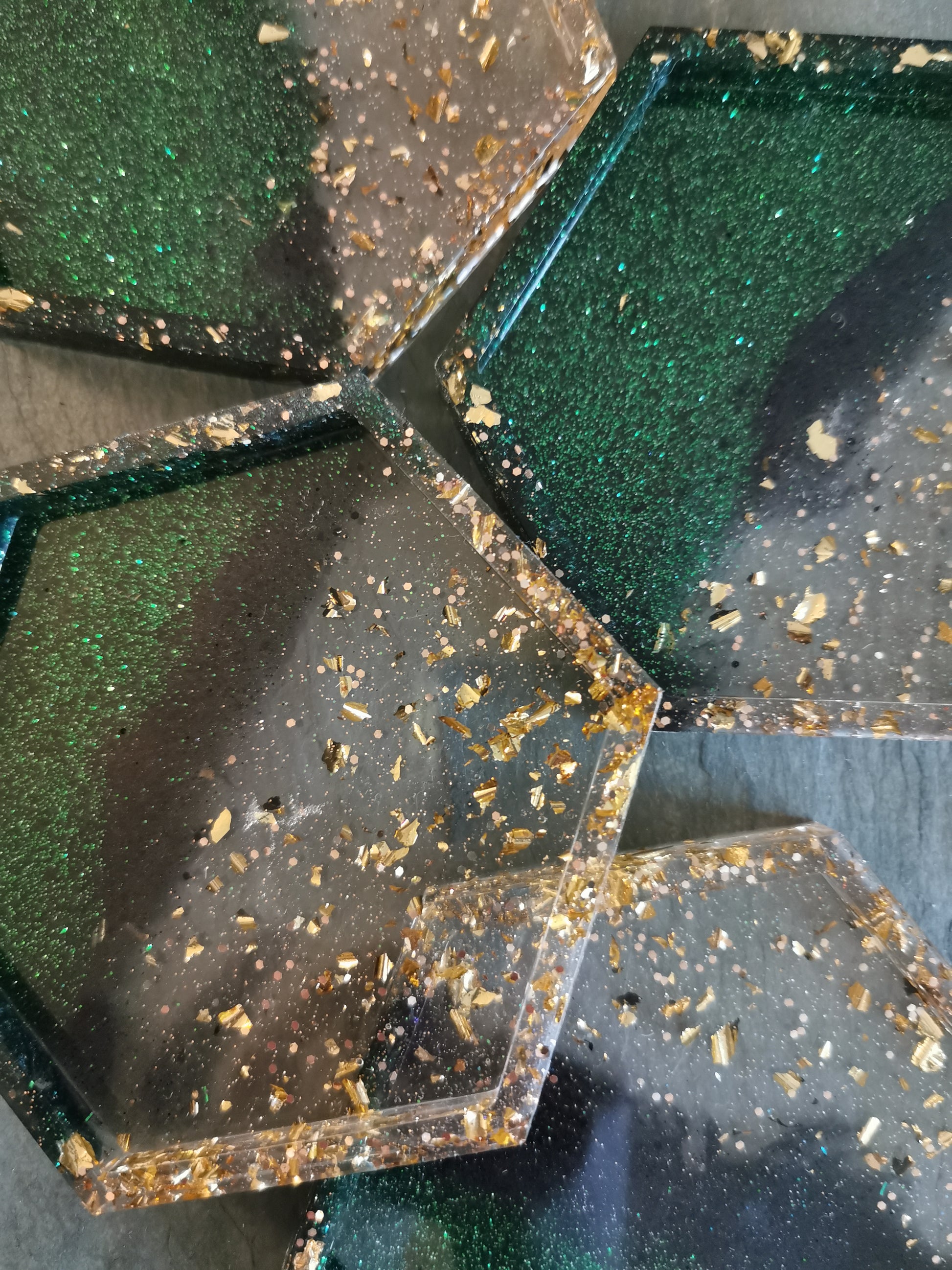 Vakre hexagon-formede glassbrikker som er håndstøpt av meg i epoxyresin, med delikate detaljer i grønt glitter, sort og gullfarget bladmetall. Hver brikke er unik, og fanger lyset på en nydelig måte som gir et luksuriøst og eksklusivt preg til borddekkingen.