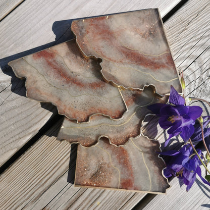 Drikkeunderlag lagd i naturfarger med malt gullkant og rosegullglitter. Kan brukes på begge sider. Undersiden har mer glitter enn oversiden. Leveres i gaveeske.