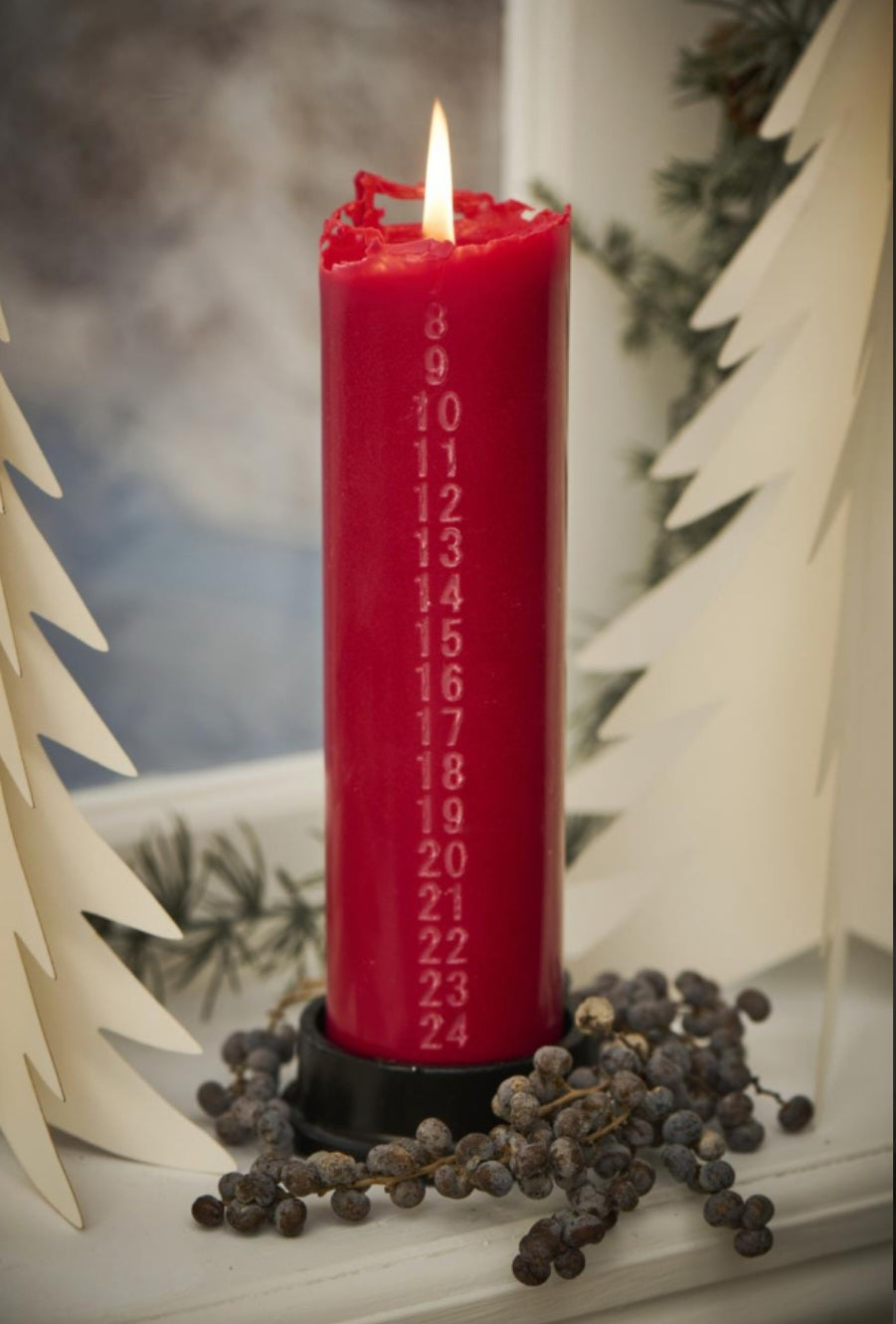 Rødt julelys med kalendertall 1-24. Lyset er fra anerkjente Ib Lausen er 30 cm høyt og 6 cm bredt.