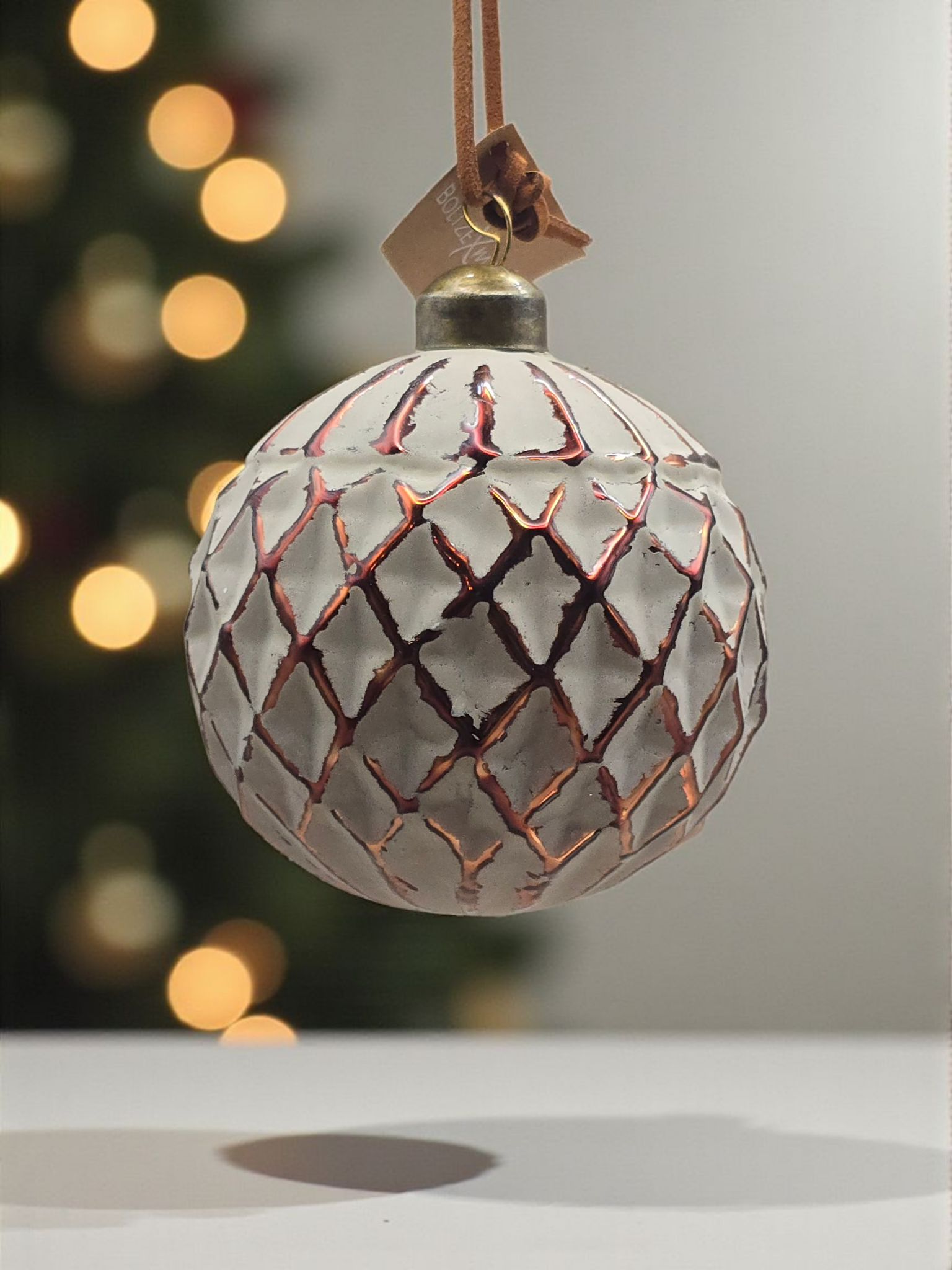 En stemningsfull glasskule i varm kobberfarge med rutet dekor og en beige kalket overflate som gir et mykt og eksklusivt uttrykk. Den subtile glansen og strukturen skaper en elegant balanse mellom klassisk juleglød og moderne design.