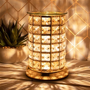 Dekorativ elektrisk aromalampe fra Sparks Giftware i England. Stor fin skål i glass, nydelige sorte prismer og enkel av/på funksjon med en enkel berøring mot sokkelen i gullfarget utførelse.