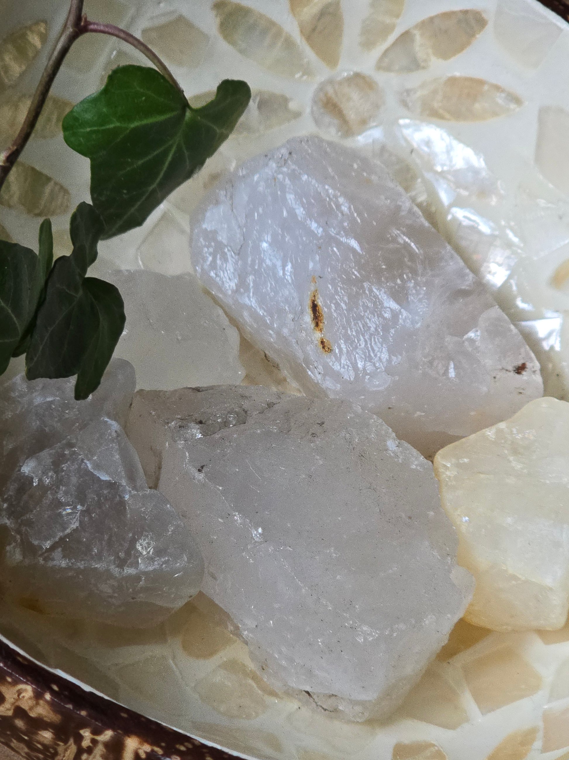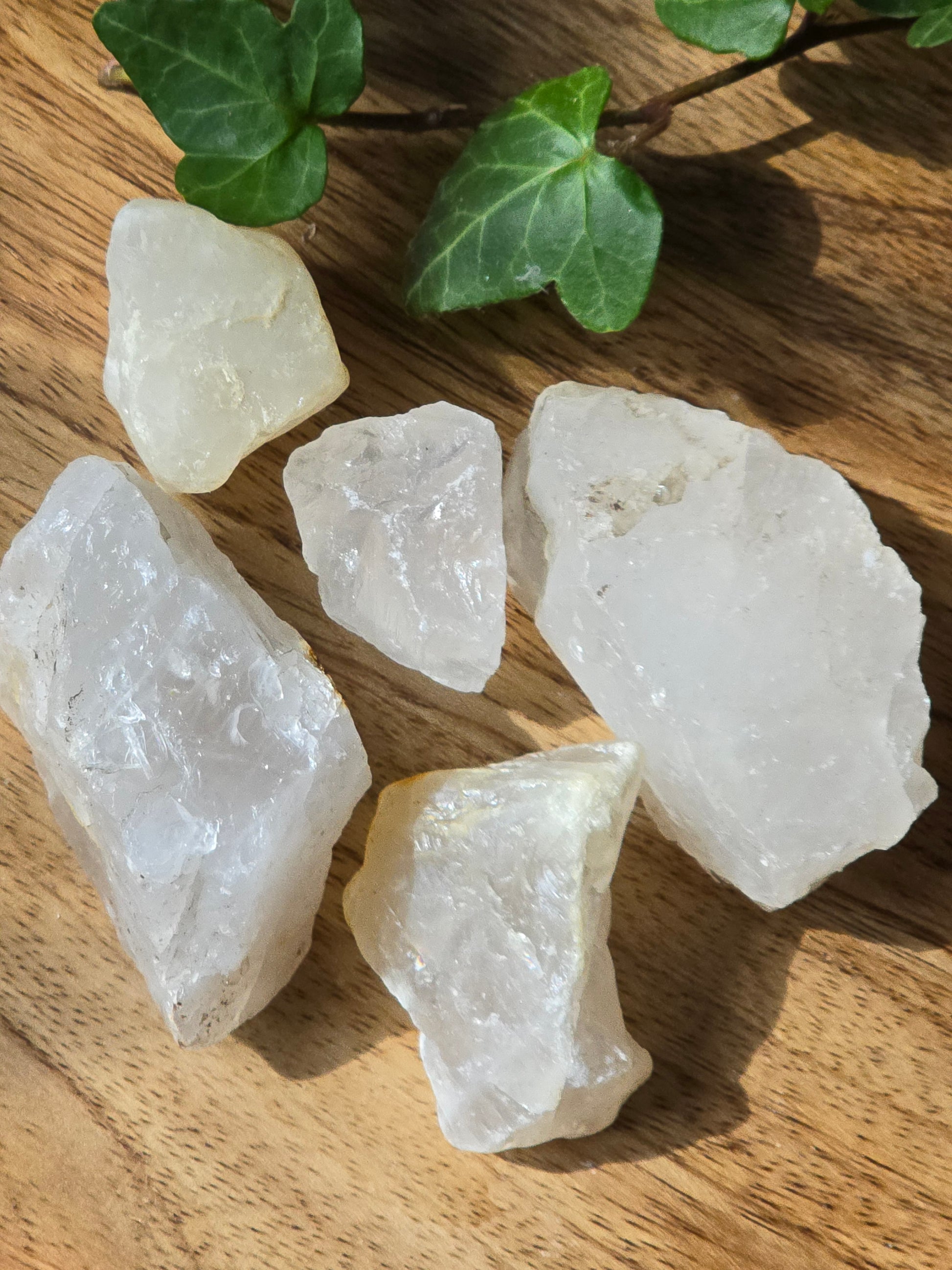 Nydelige, upolerte råstykker av kvarts. Disse stykkene har en vakker variasjon fra snøhvit melkekvarts til dypere gråtoner, og noen har unike detaljer som jerninnslag (jernkvarts) som gir dem et varmt, gyllent spill.