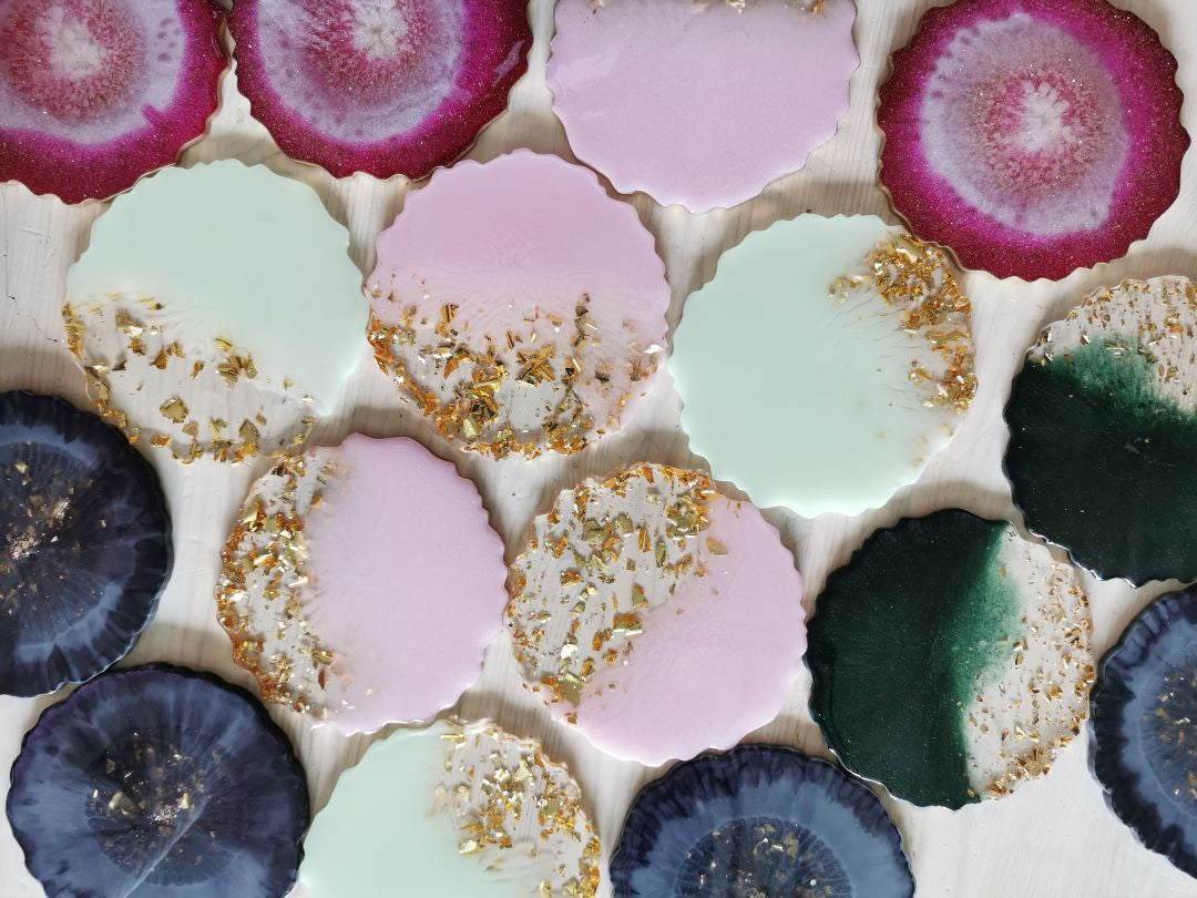 Drikkeunderlag støpt i epoxyresin. Vi farger våre coastere hovedsaklig med micapulver og flytende pigment. Vi støper ofte inn bladgull, glitter og diverse dekorative materialer.